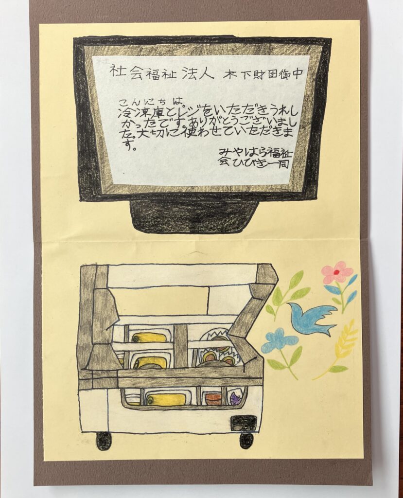 特定非営利活動法人みやはら福祉会様よりご報告 その2 Posted on 2025年12月23日 by kinoshita-zaidan とても嬉しいお届け物を受け取りました! 木下財団の助成金が少しでもお役に立てたことをうれしく思います。本当にありがとうございました。 たくさんの美味しいが皆様に届きますように。
